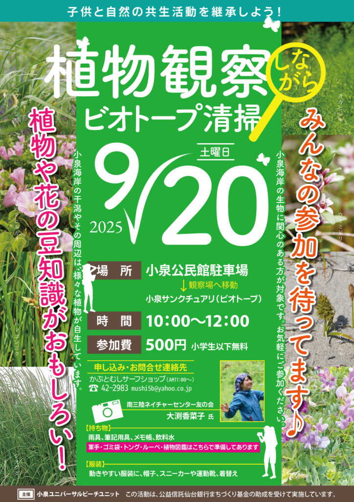 2025年9月28日 / 最終更新日 : 2025年10月4日 touji 助成事業 植物観察しながらビオトープ清掃 9月28日9月20日が悪天候だった為、28日に延期しました!南三陸ネイチャーセンター友の会の大渕香菜子様を講師に招き、小泉海岸線に生息する植物の豆知識を提供されながら観察するのが、とにかく面白い‼️今まで気にもせずスルーしていた植物に、そんな由来があるなんて😳そんな驚きの連続で、益々小泉地区への愛と探求したいという気持ちが芽生えました😊 Follow me!